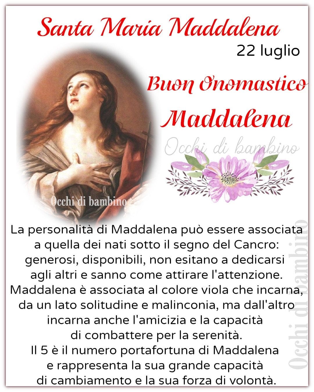 Santa Maria Maddalena. 22 luglio. Buon onomastico Maddalena. Occhi di bambino. La personalità di Maddalena può essere associata a quella dei nati sotto il segno del Cancro: generosi, disponibili, non esitano a dedicarsi agli altri e sanno come attirare l'attenzione. Maddalena è associata al colore viola che incarna, da un lato solitudine e malinconia, ma dall'altro incarna anche l'amicizia e la capacità di combattere per la serenità. Il 5 è il numero portafortuna di Maddalena e rappresenta la sua grande capacità di cambiamento e la sua forza di volontà.