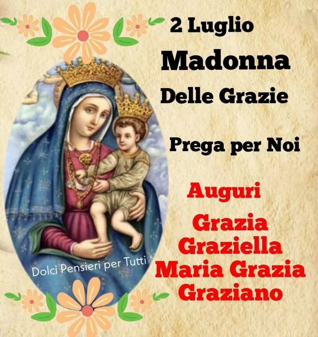 2 luglio. Madonna delle... 2 luglio. Madonna delle grazie. Prega per noi. Auguri Grazia, Graziella, Maria Grazia, Graziano. Dolci pensieri per tutti. Link: Codice HTML: Codice BB: Madonna delle Grazie Immagini Immagini Simili